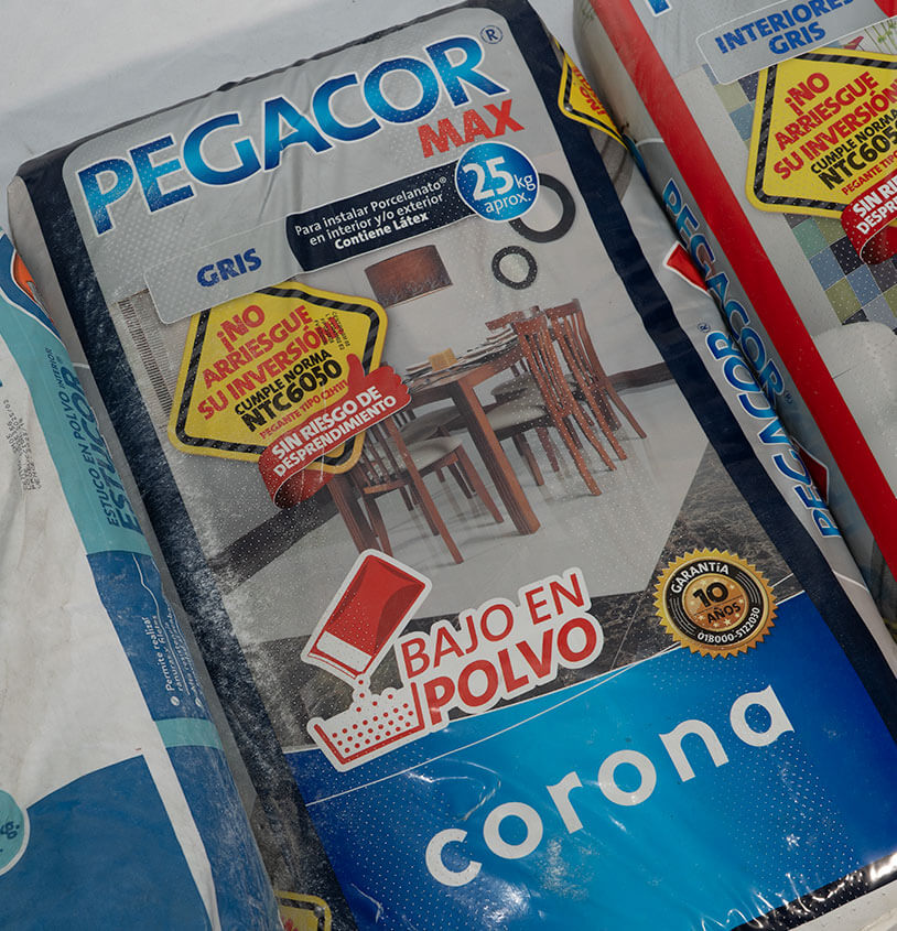 - Pegacor Interiores Blanco, adhesivo cementicio en polvo, ideal para cerámica en interiores. Recomendado para pisos y paredes sobre mortero, losa, ladrillo o bloque.